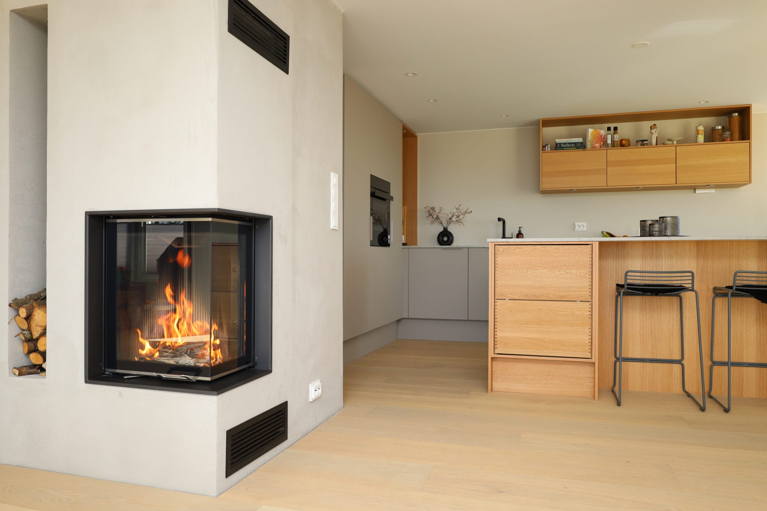Skaper en visuell harmoni med hjørneplassering – utnytter rommets geometri til å fremheve ildstedet som et designelement.