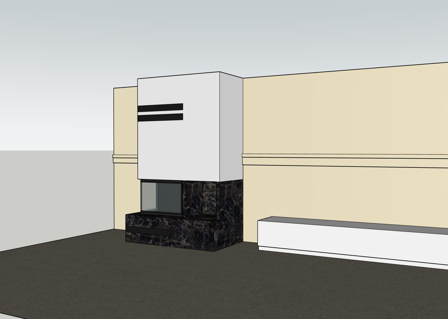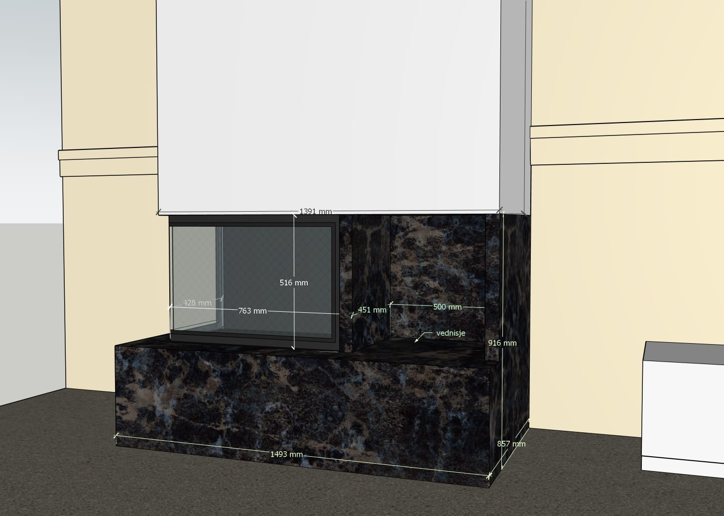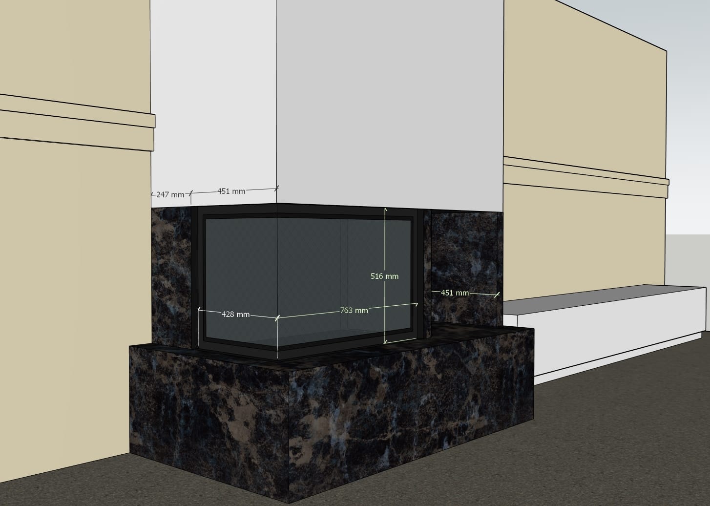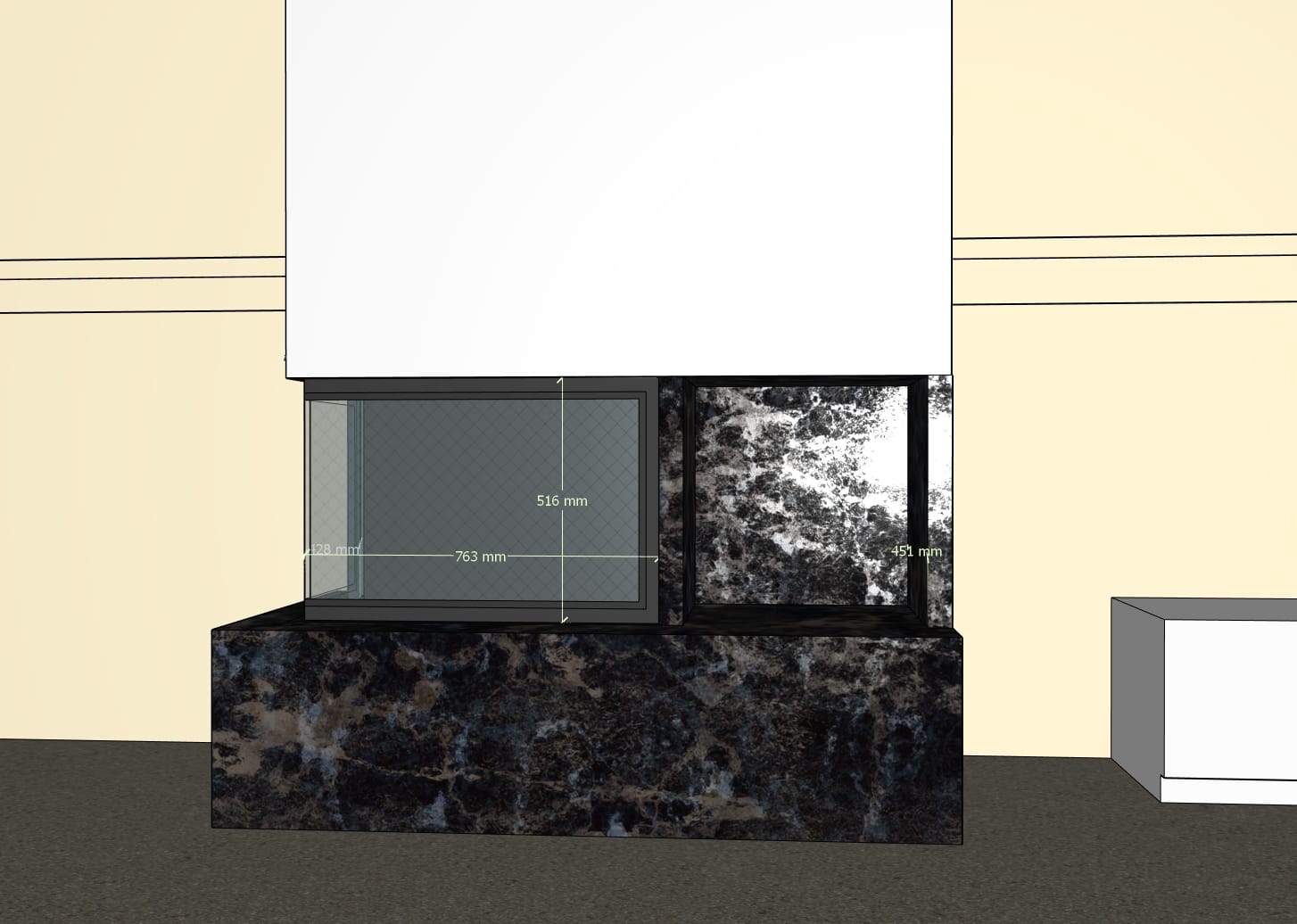 Det helglassede dekorglasset gir peisen et elegant og moderne utseende, samtidig som det fremhever flammebildet.