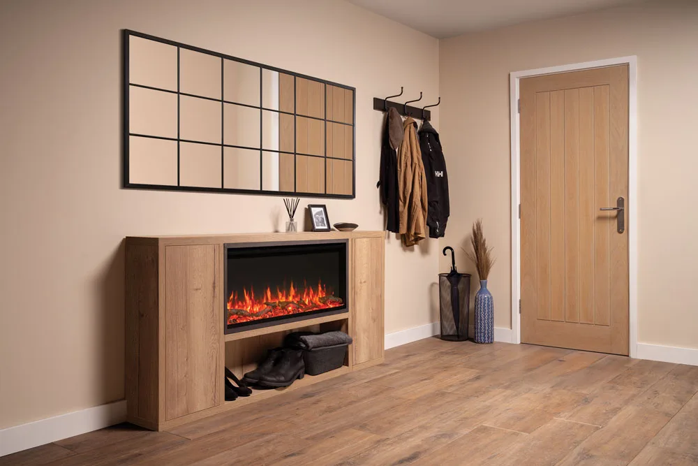 Atmos 105R Venezia Suite kombinerer en stilfull eikefinish med et solid flat-vegg-design, som er ideelt for hjem uten skorstein. Med enkel og problemfri installasjon tilbyr Venezia Suite følgende: